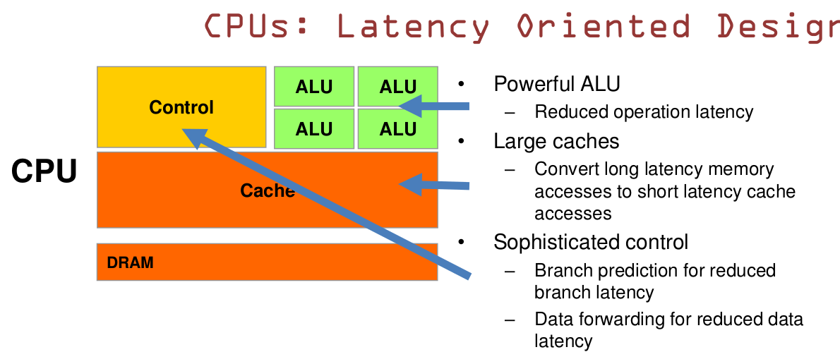 GPU的虽然有dram延时,却有非常多的ALU和非常多的thread. 为啦平衡内存延时的问题,我们可以中充分利用多的ALU的特性达到一个非常大的吞吐量的效果。尽可能多的分配多的Threads.通常来看GPU ALU会有非常重的pipeline就是因为这样。