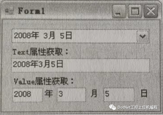 private void Form1_Load(object sender,EventArgs e) { //使用控件的 Text 属性获取当前控件选择的日期 TextBox1.Text = dateTimePicker1.Text; //使用 Value 属性的 Year 方法获取选择日期的年 textBox2.Text = dateTimePicker1.Value.Year.ToString(); //使用 Value 属性的 Month 方法获取选择日期的月 textBox3.Text = dateTimePicker1.Value.Month.ToString(); //使用 Value 属性的 Day 方法获取选择日期的日 textBox4.Text = dateTimePicker1.Value.Dey.ToString();}