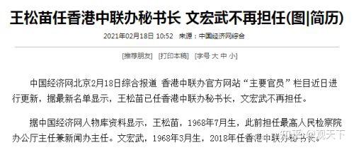 据中国经济网北京2月18日综合报道,香港中联办官方网站“主要官员”栏目近日进行更新,据最新名单显示,王松苗已任香港中联办秘书长,文宏武不再担任。 这也恰恰印证了此前港媒透露,香港中联办秘书长文宏武将参与这家“文化央企”的筹建工作。 不过,他并不一定是“文化央企”的一把手,可能另外委任高官担任董事长。