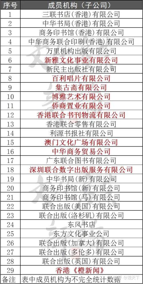 集团旗下包括三联书店、中华书局和商务印书馆、万里机构等多家知名出版机构,出版的图书约占香港每年中文图书出版量的1/5。 除此之外,还包括新雅文化、博雅艺术、深圳联合数字、网媒“橙新闻”、侨商置业等子公司,投资还涉及地产、自建楼宇及物流等业务 (见下表)。