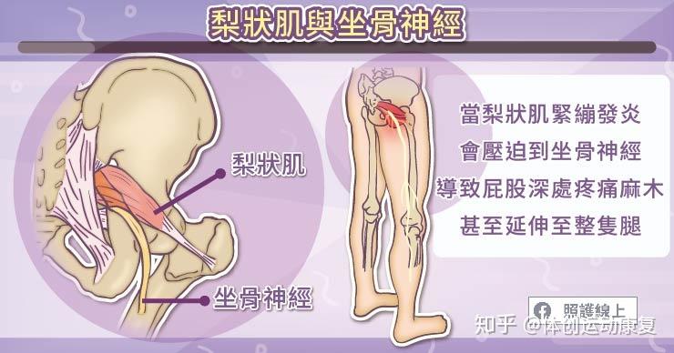 梨状肌变得持续收缩紧绷、发炎肿胀,会压迫到一旁经过或穿过的坐骨神经,刺激到坐骨神经,引发患者于屁股、髋部附近的疼痛、麻木