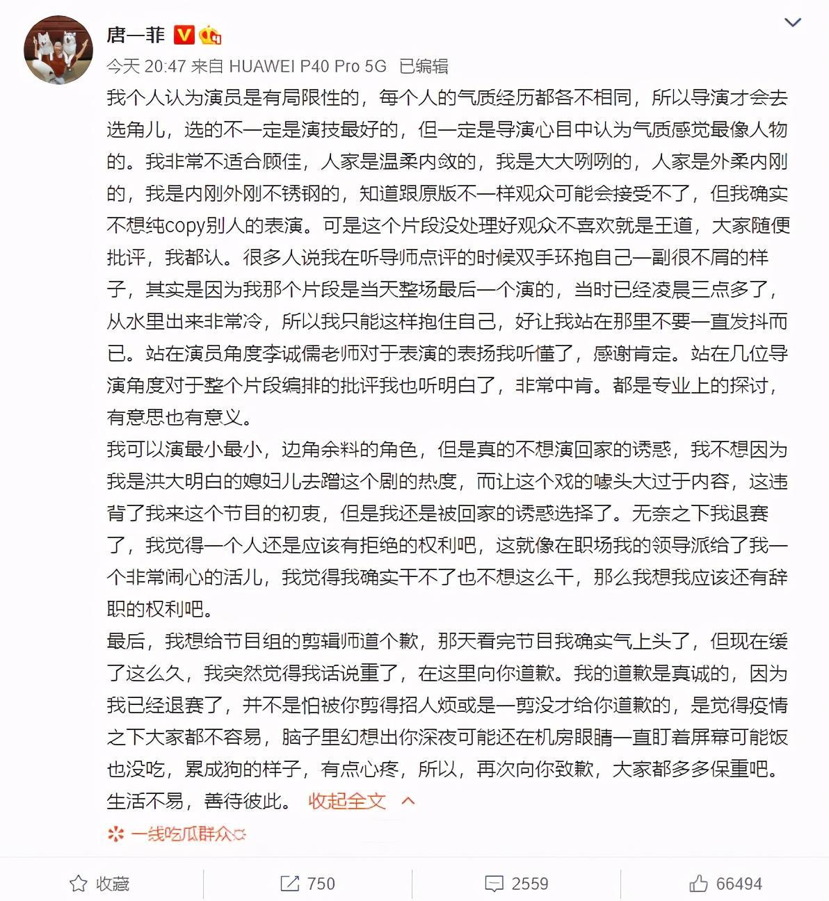 上了热搜之后,唐一菲本人发长文回应了退赛的事情。她说: