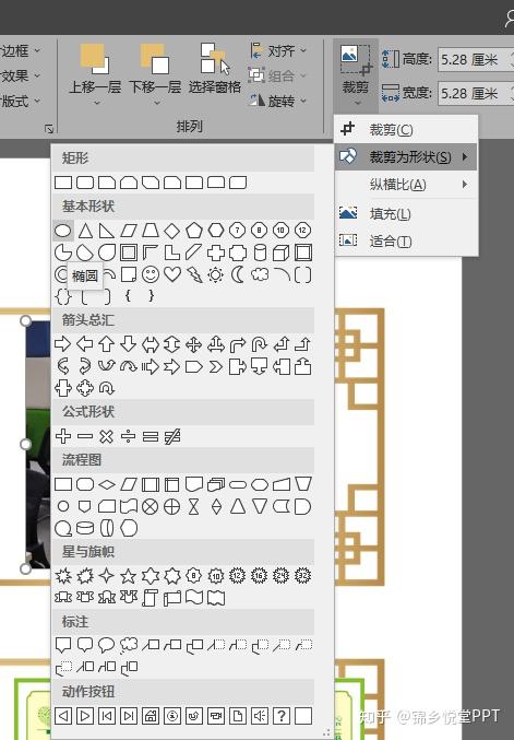 然后再点击“裁剪”按钮,选择“裁剪为形状”下的椭圆即可: