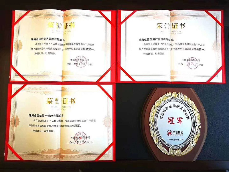 2019年:华联期货首届私募机构期货挑战赛,基金组年度总冠军。其中连续两个季度获得基金组别第一名;