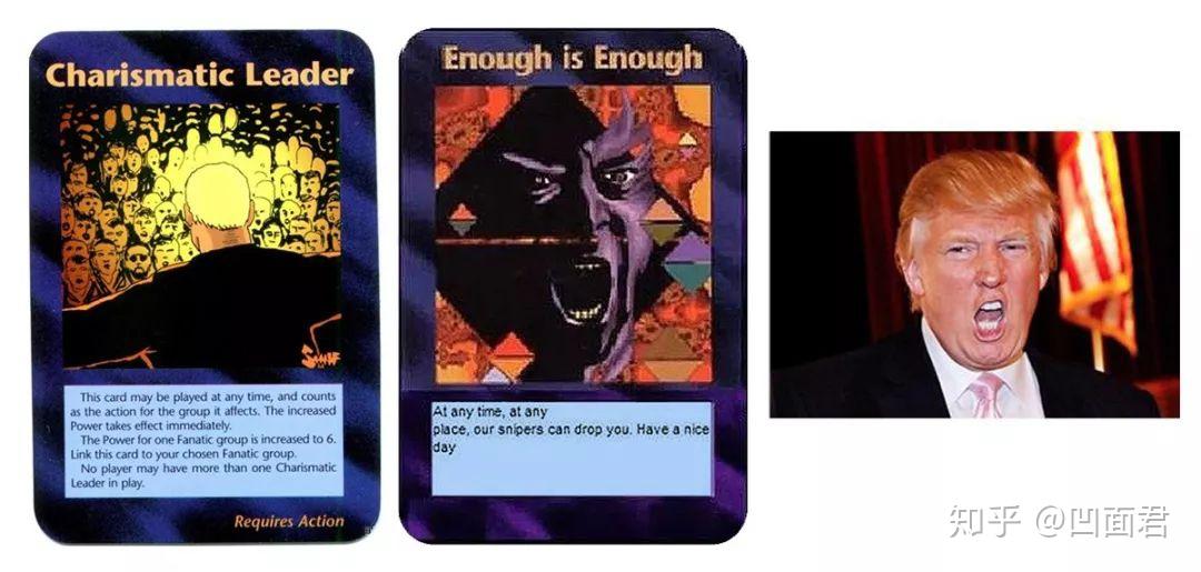 预测了特朗普当选,右边卡牌上的描述是:“ 任何时间,任何地点,我们的狙击手都会放倒你。过得愉快。 ”