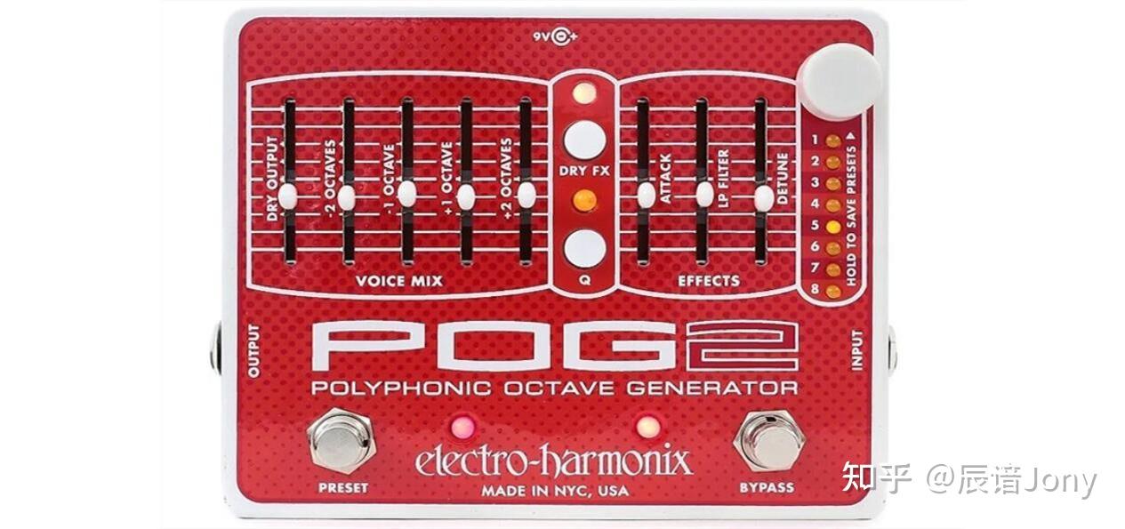 在电吉他效果器里,移调效果器可能更常用的还是 八度(Octave) 效果器,这类效果器可以让吉他弹出超高音或者超低音。下图是Electro-Harmonix pog2 octave八度效果器。