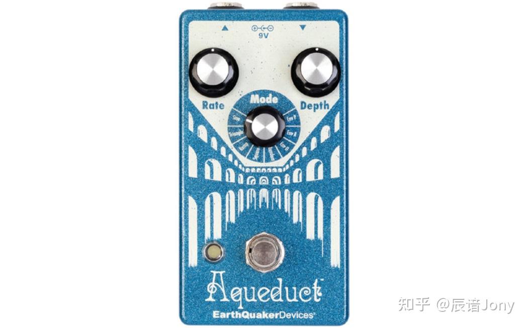 在电吉他效果器上,这两种效果器的区别可能就在于变化的指标了。Tremolo的变化指标是音量,Vibrato的变化指标是音调。下图是EarthQuaker Devices Aqueduct Vibrato颤音效果器。