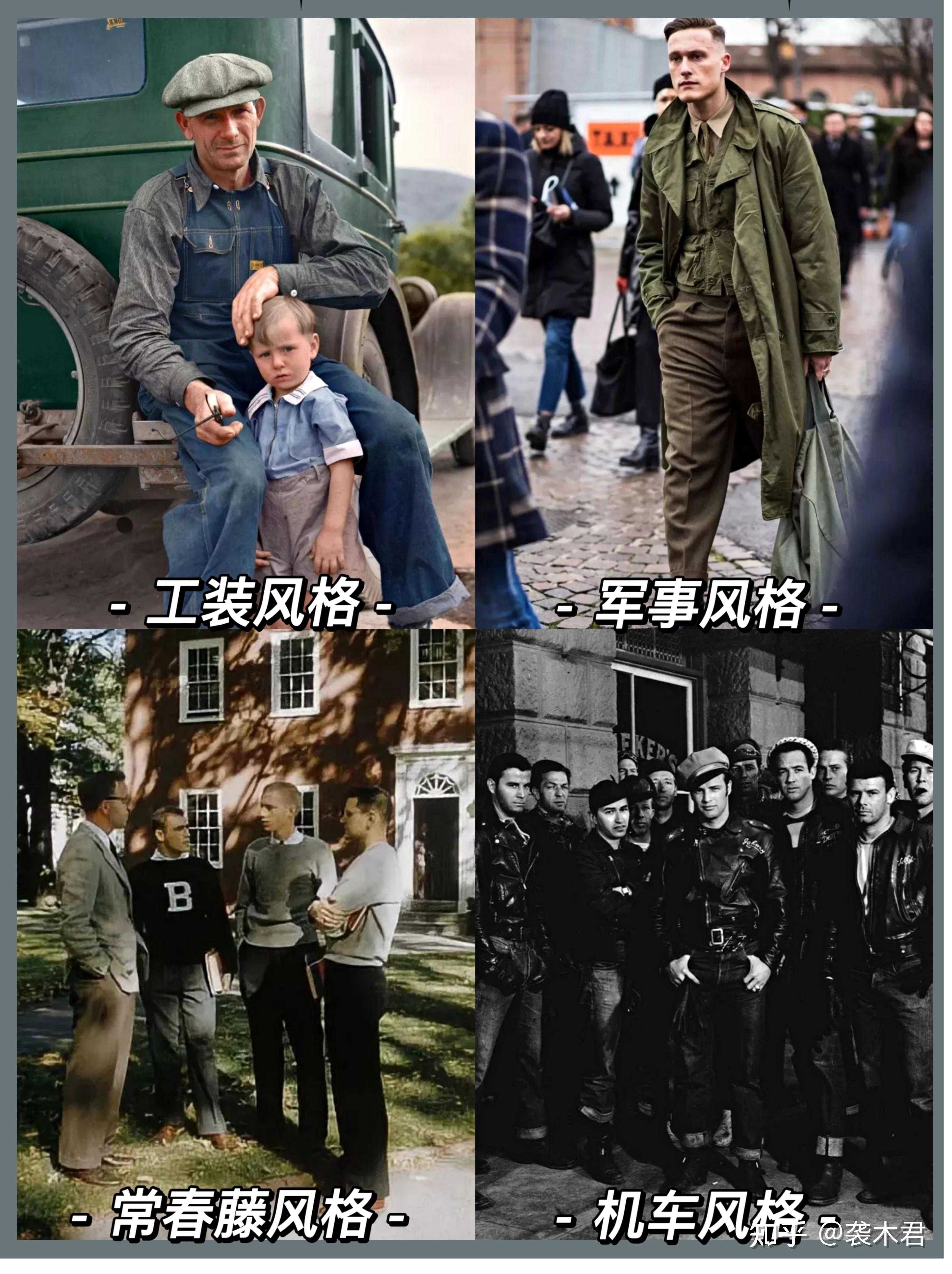 不过我们并不用在意这些有点学术的东西,只需要记住,阿美咔叽主要体现为一种复古的穿着方式,主要包括工装、机车、军事这几种有代表性的风格就好。下面就来简单了解一下这几种风格。