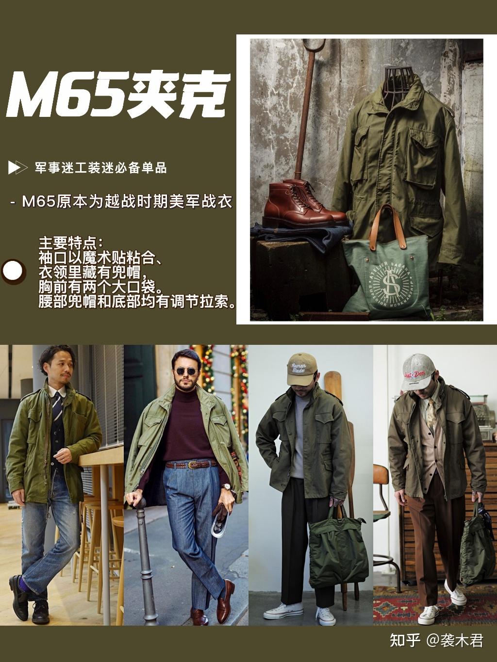 工装元素多数是单宁、连体裤、帆布鞋、工装靴。军事风格一般是厚实的面料硬挺的版型。风格元素多为迷彩、军绿、M65野战夹克、M51大衣、原牛、多口袋军裤等等。
