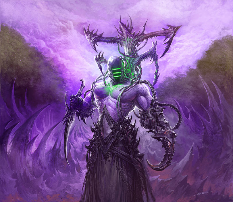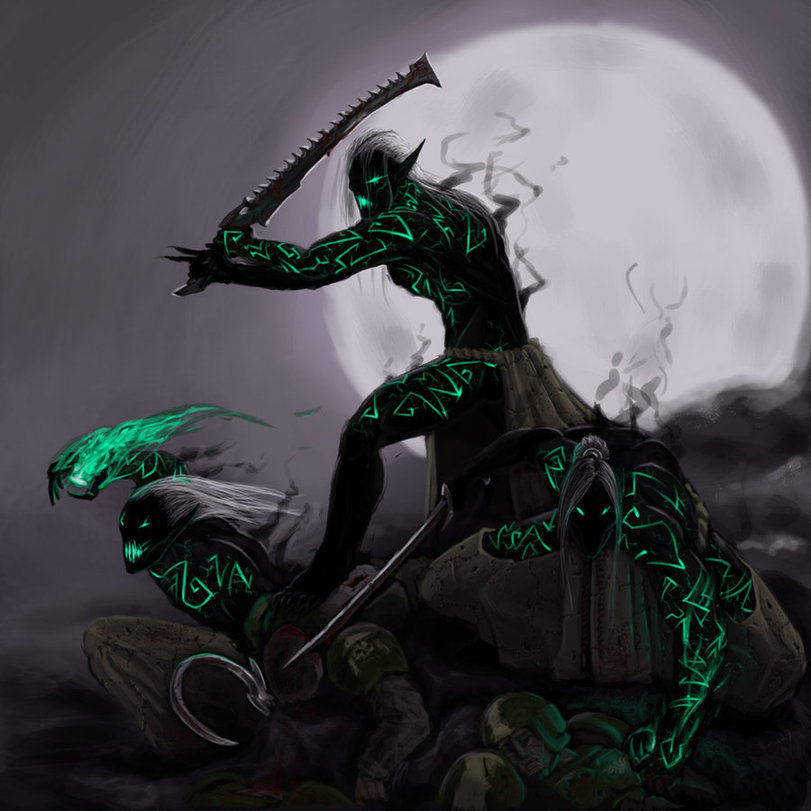 曼德拉是一种令人毛骨悚然的存在,起源未知,他们全身漆黑如夜却又白发如雪、面部是一团模糊的阴影、身披寥寥几片人皮、拎着寒光闪动的锯骨大刀、身上还画着会吸收生命力的幽光符文。 曼德拉只生活在一个纯粹黑暗的超维度空间中,大多数黑暗灵族都认为他们只是无用的低等生物,但许多执政官都乐于雇佣曼德拉作为刺客,因为这群活体阴影一般的怪物可以自由出入暗影, 许多受害者只在转瞬间就消失不见——被从自己影子里出现的曼 德拉拖进了黑暗维度。理论上讲他们能传送至任何黑暗的地方,比如你的被窝。