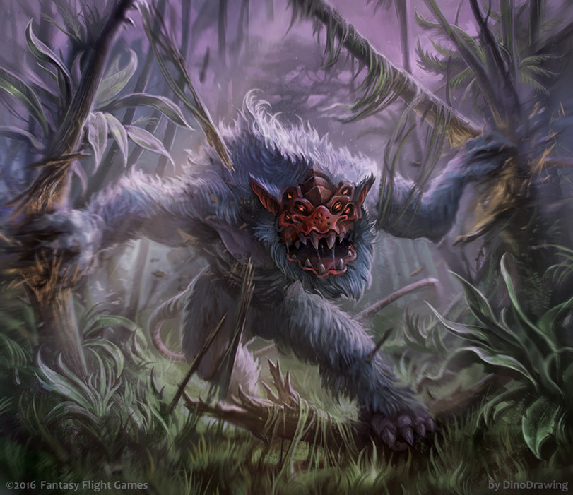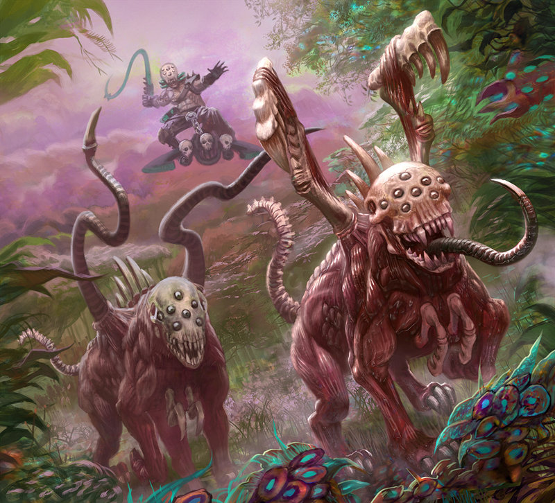 黑暗灵族作为宠物或战争野兽所使用的众多生物之一,看起来就像大猩猩与蝙蝠的混合体,有些类似中古战锤中吸血鬼的蝠狼。 这玩意儿本质上就是一大块肌肉,它的六只眼睛可以看到三种不同的光谱,大耳朵可以在任何环境中接收到最轻微的声响,每根爪子都比兽人的手指还长而且几乎像单分子刀刃一样锋利,可以刨开比自己体宽还要厚的飞船舱壁。