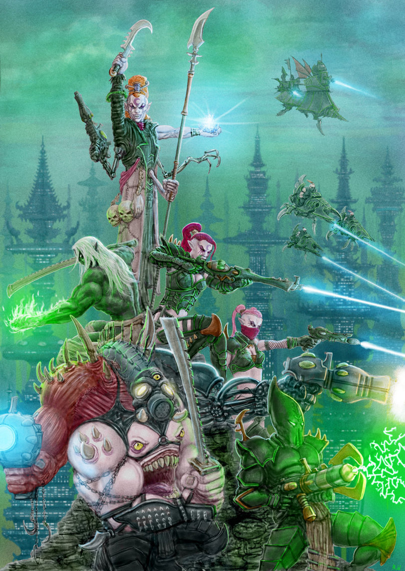 黑暗灵族无疑是第41个千年以来最堕落最邪恶的种族,连混沌星际战士跟这群虐待狂&精神病比起来都像社区服务志愿者一样和蔼可亲。 黑豆芽的部队是典型的玻璃大炮:速度极快且能轻松造成巨量伤害,但在遭到切实打击的时候会死的非常顺滑。他们的许多轻型装甲载具甚至能被反步兵枪械打爆,而许多步兵兵种的护甲只会遮挡胸口和裆部,也就是说这些护甲近乎半裸的穿戴者——虽然大部分时候动作都快到能躲开子弹—— 在面对枪林弹雨时偶尔会 需要 依靠自身高超的技巧来努力让对方只能命中自己的胸部或下体 。瑞斯拜。