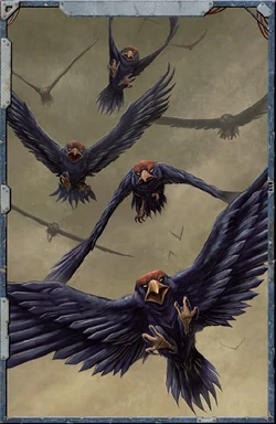 一种大型鸟类生物,驯兽师的明星伙伴,还有一款与之同名的飞行器。 刃翼鸦的大小和鹰差不多,是一种特别凶猛且高效的空中捕食者,它们飞行速度极快,因羽毛像剃刀一样锋利而得名。 刃翼鸦的爪子和喙足以撕开深可见骨的伤口,而锋利的羽毛在速度加持下完全可以进行斩首攻击。帝国学者认为其特化羽毛来自饮食中过多的钙质,因为它们特别喜欢粉碎和吃掉猎物的骨头。