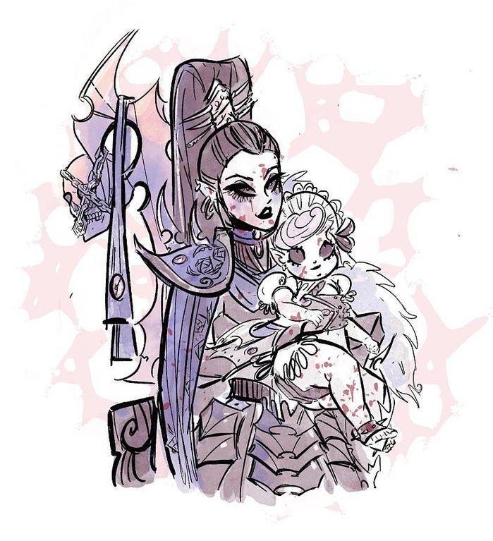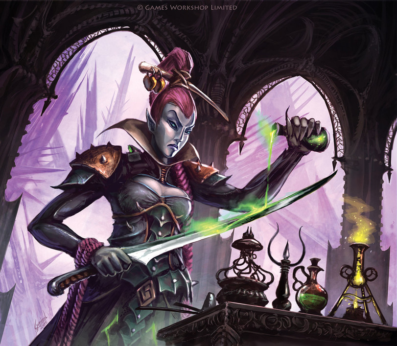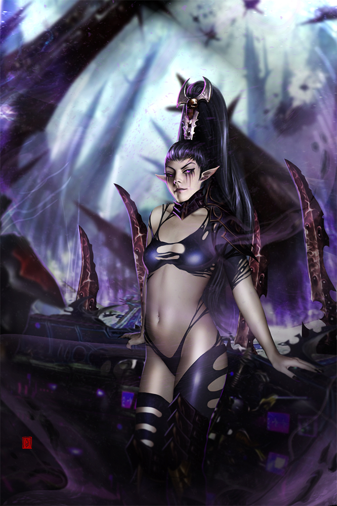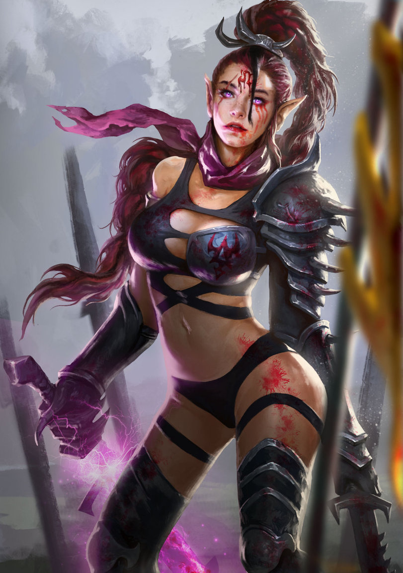 不要跟色孽魅魔 (Daemonettes,其实直译过来应该是魔女,但TTW里翻译成欲魔还挺好的) 搞混了。 当一名巫灵足够凶猛强悍以至于可以制霸科摩罗的血腥角斗场时,她就会被称为魅魔——巫灵教派内最善战、最优雅、最迷人的女战士。 魅魔可不仅仅是竞技场里的明星脱衣舞娘,她们在黑暗灵族社会有着王族般的高贵地位,在赛场之外特别注重护肤和养生: 毕竟还是要进场演出的嘛,观众当然更喜欢看能让人一柱擎天或者水流成河的暴力美少女而不是全身伤痕累累的肌肉憨妹。 但这些刀剑花魁又不可避免地必须面对一场场角斗及其带来的伤疤,而且总有一天会毁容或者死去,可真是黑暗沉重。魅魔经常参加阴谋团的劫掠活动,主要是为了猎杀一些强悍的目标来给自己贴金,而最受欢迎的猎物则是方舟灵族的司战者。