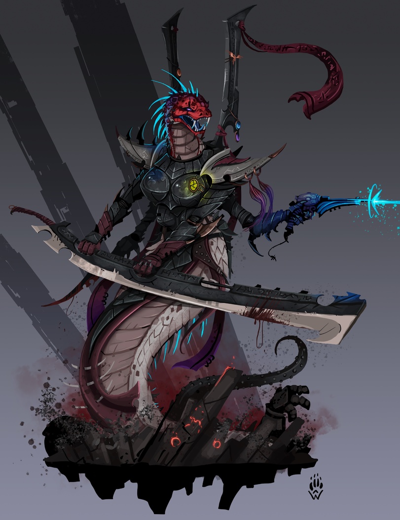 异形雇佣兵,执政官的忠诚保镖。蛇人在几千年前也像曾经的灵族一样陷入纵欲不可自拔,并因此迅速成为黑暗灵族最喜爱的物种之一。 这些四手蛇怪可以携带足量的刀片或枪械来干掉任何蠢到敢于攻击他们雇主的家伙。 蛇人保镖在科摩罗很流行,主要原因是他们特别忠诚,毕竟头脑正常的黑豆芽都知道不能将后背交给给同族保护。而且蛇人特别硬,身上的鳞片可以抵挡大部分近战武器,就算失去一支胳膊也还拥有86%的战斗力,再加上他们脑子不太灵光所以拿来当保镖&肉盾特别的好使。