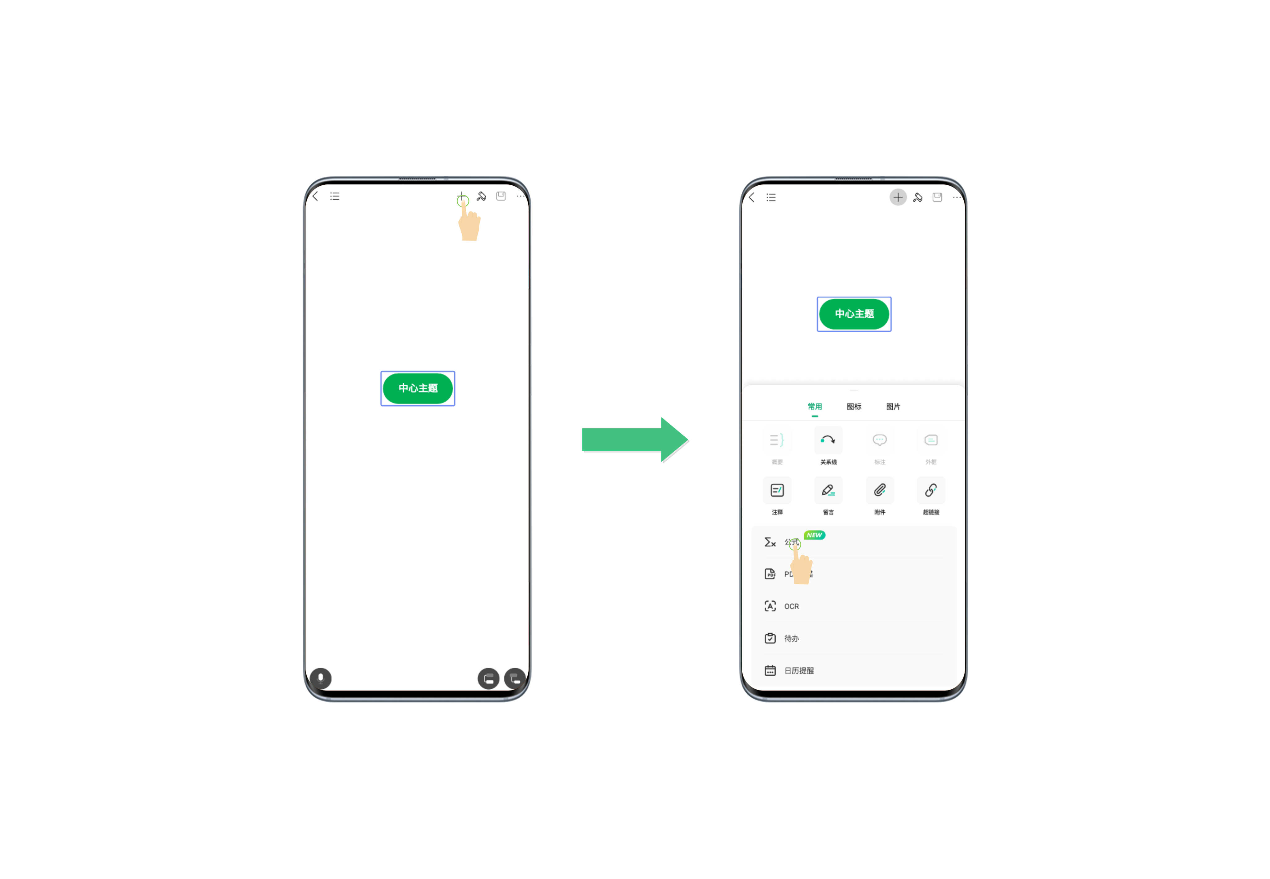 选中需要插入公式的主题,点击上方工具栏“+”,在弹出窗口中选择“公式”