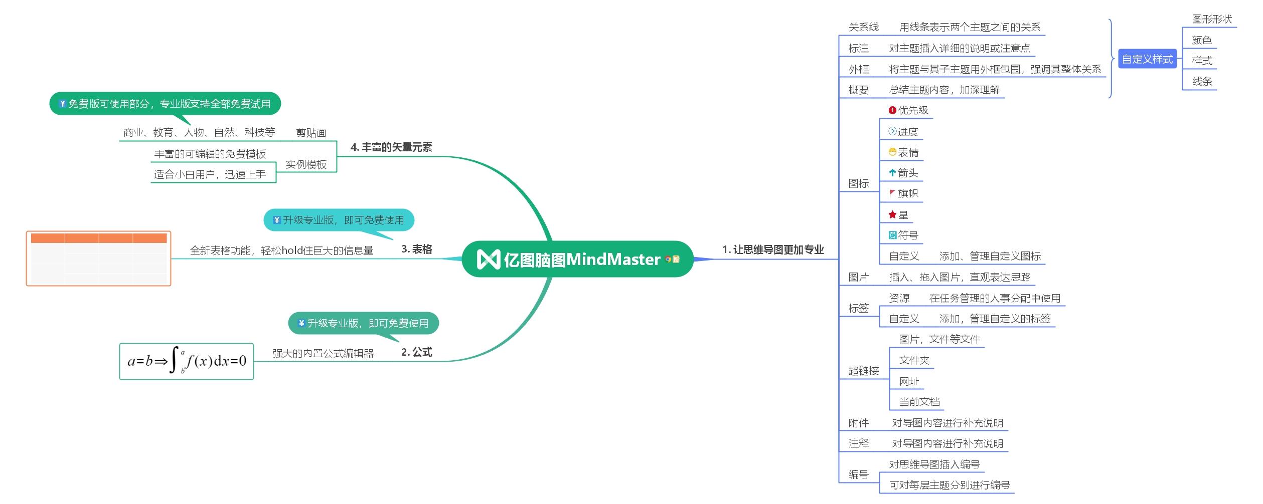 等内容让思维导图更专业,以下导图详细例举了MindMaster可以实现的功能。