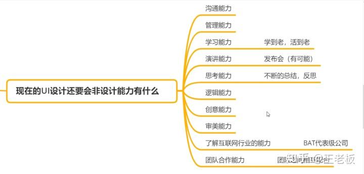 沟通能力,管理能力,学习能力,演讲能力,思考能力,逻辑能力,创意能力,审美能力,用户体验,用户研究,团队合作能力,了解互联网行业像这些我们也是需要去掌握的。
