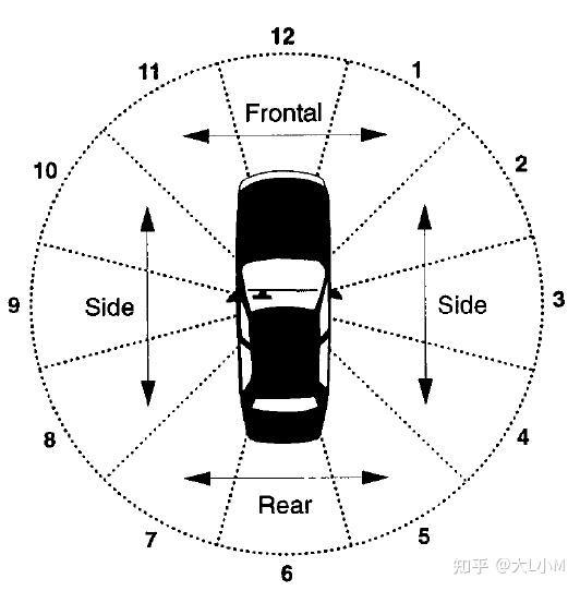 车辆发生碰撞,大致可以按照钟表的时间来划分为正面碰撞、后面碰撞和侧面碰撞等3个区域。