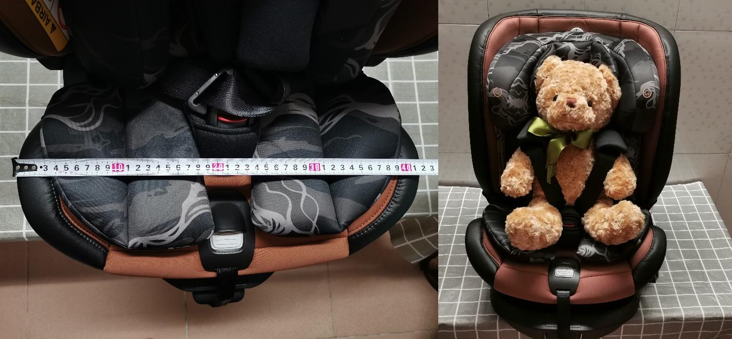 这款安全座椅的有效乘坐宽度约为34cm,完全可以很好地包裹小熊,这也相当于是新生儿的体型了。 当孩子长大以后,会拆掉内衬套,则孩子的实际乘坐空间也会进一步增大。