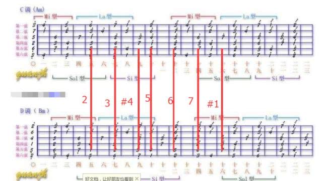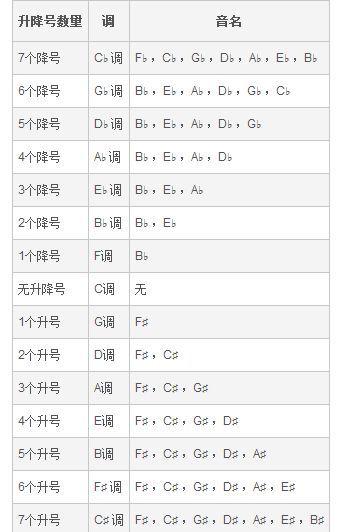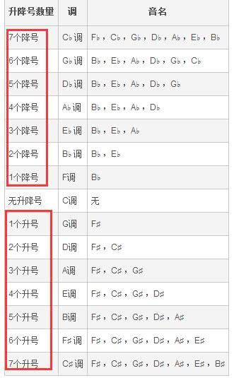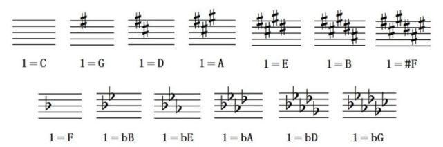 这是不是一目了然可以看出来什么调哪些音是不同的?不过其实还有更加方便的方法,我们已经知道如何看简谱和吉他谱的调了,可是五线谱又如何去看呢?