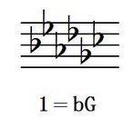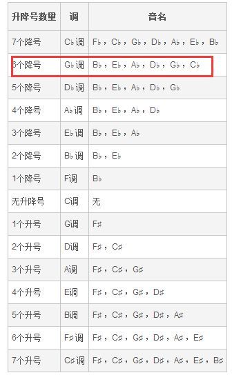 这是一个降G调,那么图中有6个降号,降号的音分别是si mi la re sol do,也就是说这个调是降si,降mi,降la,降re,降sol,降do音,我们来对一对是不是这样?看降G调的降音
