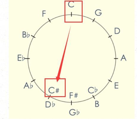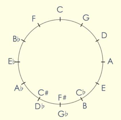 以C开始,顺时针走,每个字母都是相差5个度的,也就是说顺时针数的时候,是依次增加一个升号,直到增加到C#的位置,7个升号。