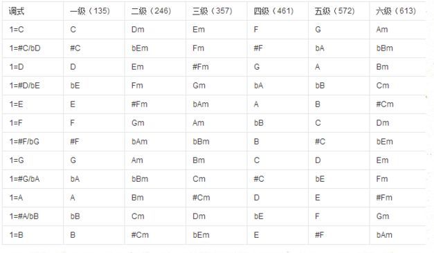 还记得我们的和弦图吧?其实和弦同样也会因为不同调什么音需要升降其和弦也会升降。下面大家自行看看就行,不多讲。