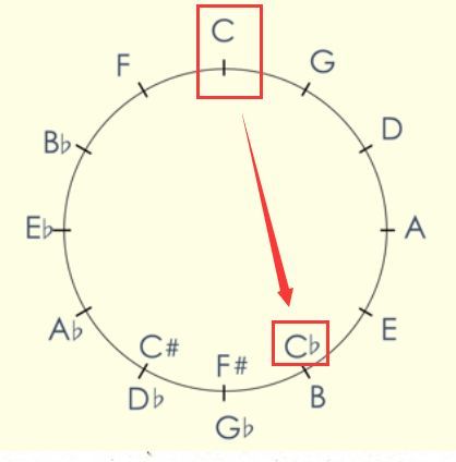 反过来。逆时针走的话,就是依次增加降号,逆时针数的时候我们需要反过来数5个度,也就是CBAGF这样的逆向数,同样数到降C刚刚好7个降好。