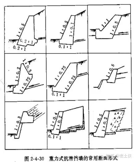 a、抗滑挡墙比普通重力式挡墙胸坡缓、外形矮胖。