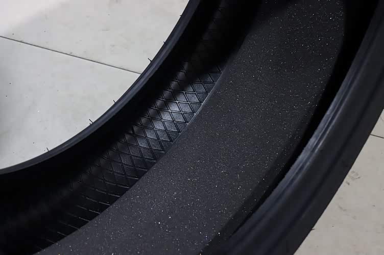 官方宣传这是独创象牙黑绒面,通过纳米级激光雕刻工艺实现象牙黑视觉,提升设计美感,长时间使用也不会发白,这个倒是有点意思,轮胎用旧了侧面发白看起来脏兮兮的,上轮胎蜡倒是会变黑,但麻烦又伤胎。