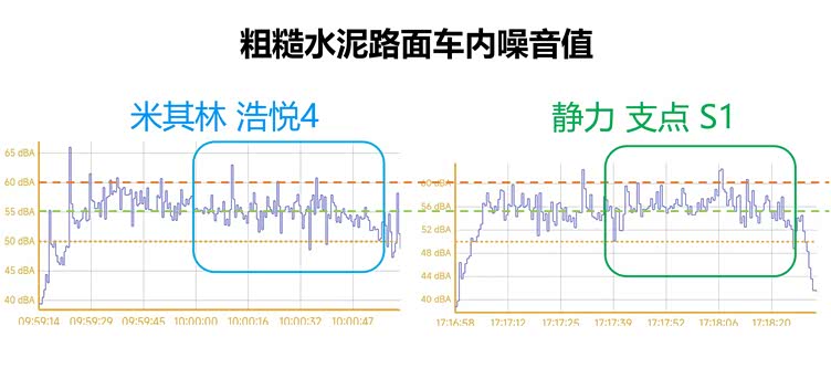 路噪较明显的平整柏油路面,两款胎都很安静,浩悦4将噪音值在54-58db区间,静力支点S1噪音值在56-58db区间,浩悦4更安静一点。主观感觉在安静柏油路,浩悦4几乎听不到胎噪,静力支点S1很安静,但仍能听到底噪存在。