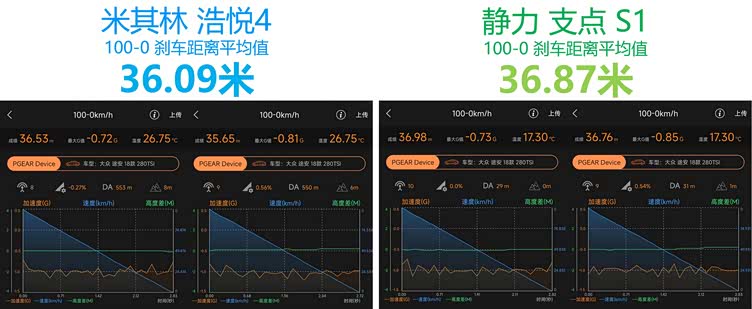 两款胎刹车距离都很出色,百公里刹车距离都少于37米,米其林浩悦4比支点静力S1刹车距离更短0.87米。