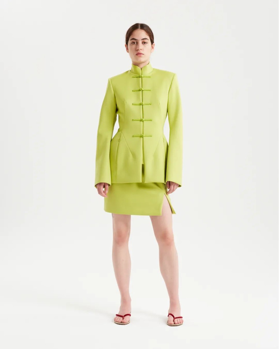 SAMUEL GUI YANG特点:以崭新的角度诠释东方韵味,廓形独特,剪裁精致。标志性元素:硅胶材质的盘扣。发布SAMUEL GUÌ YANG与 ICICLE 之禾的2021 秋冬合作系列。