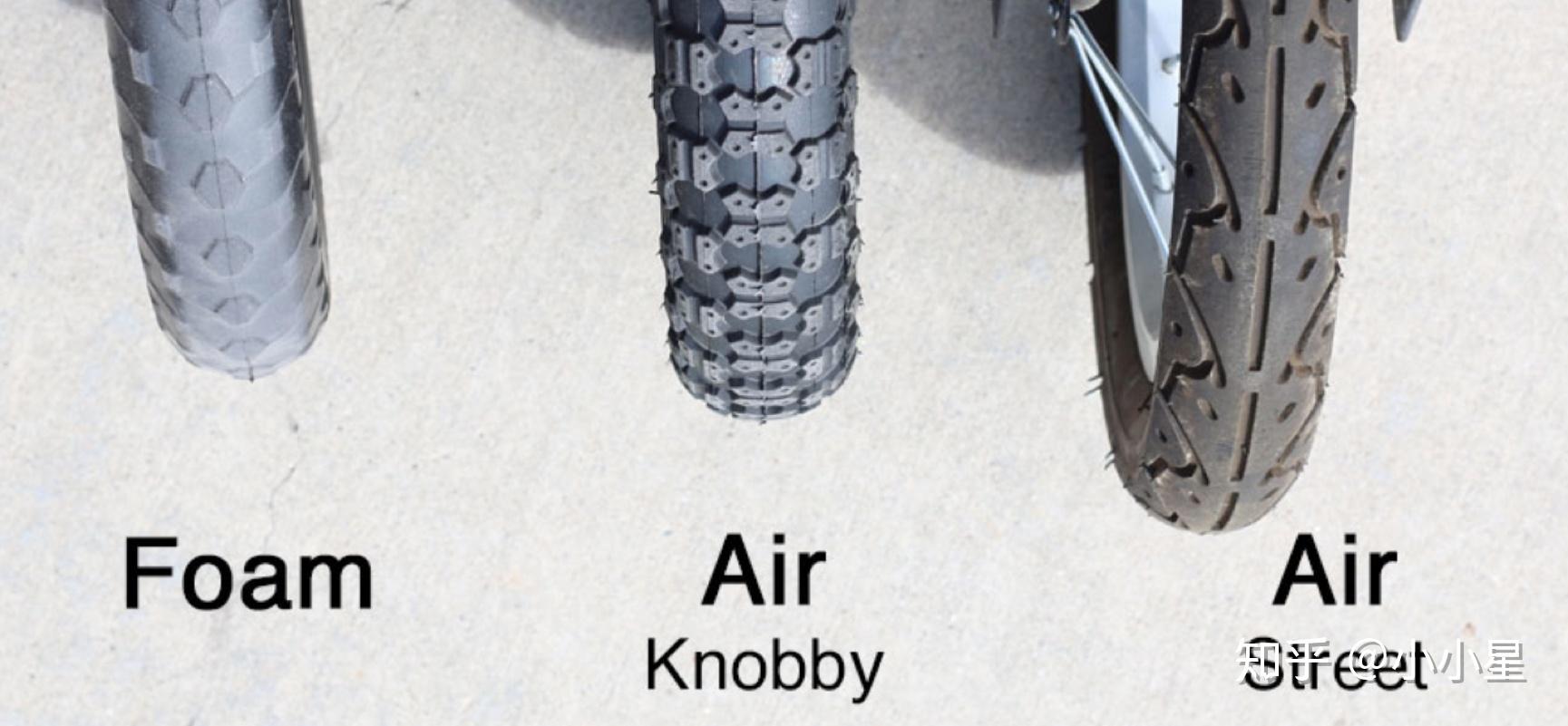 总的来说, 充气轮胎的缓冲性能和抓地力是最好的 ,其次是实心橡胶轮。橡胶轮和EVA发泡轮虽然是实心的,不怕扎,但是耐磨性和骑乘体验就没有那么好了。大家可以参考下面这张图,最左边是发泡实心轮,右边2个是充气轮,质感差别明显,大概是奇瑞和法拉利的区别?哈哈哈