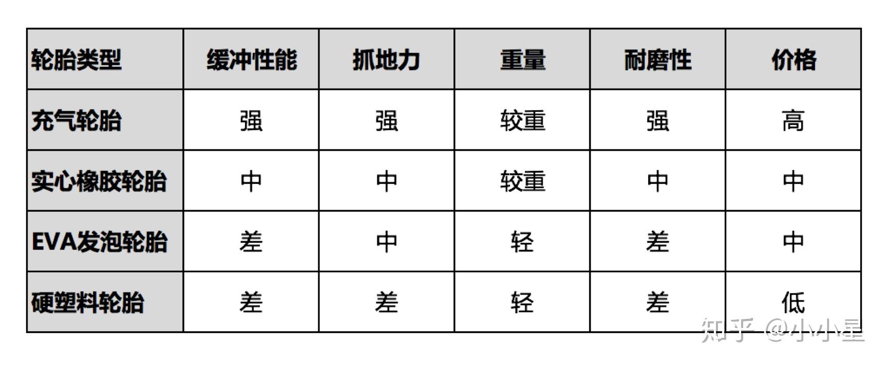 为方便对比,我们从轮胎的缓冲性能,抓地力,重量和耐磨性来综合评估: