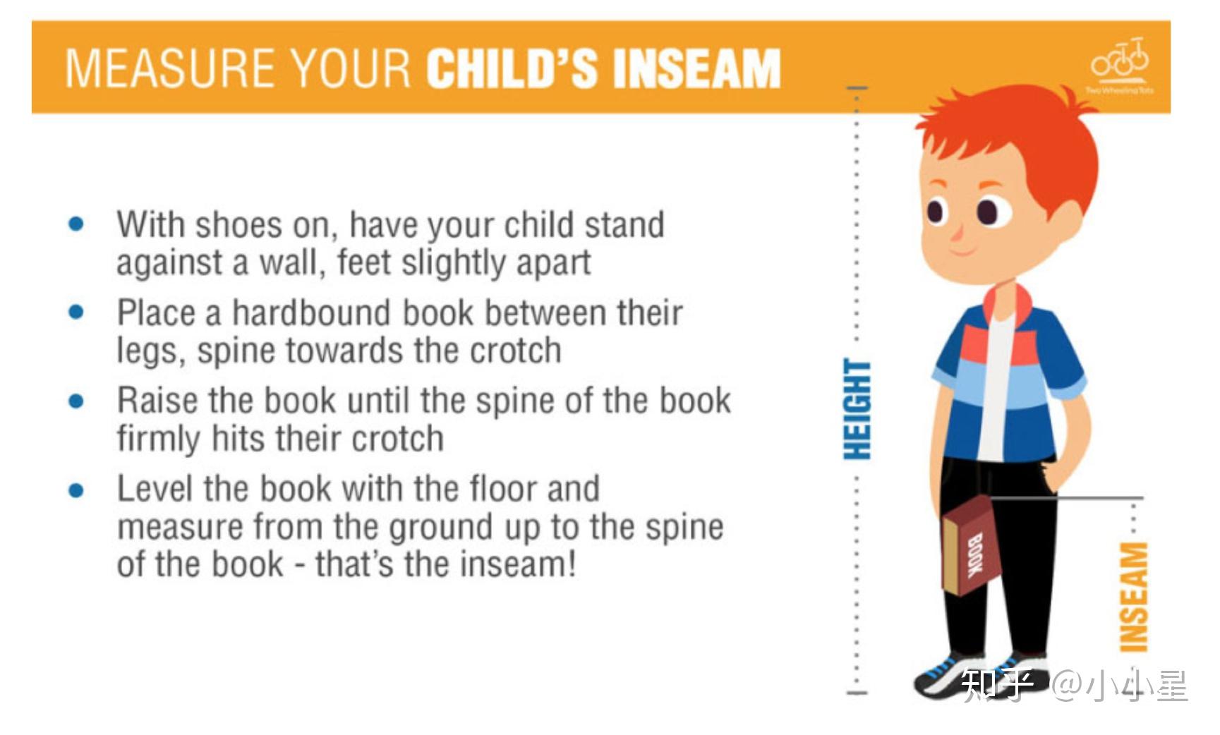 如何确定坐垫的高度呢?国外的一篇平衡车的测评网站给出了一个方法,让小孩穿上鞋,靠墙根站立,双腿中间夹一本书,书脊面朝上紧贴裤裆,然后测量书脊面到地面的高度。 这个高度减去3-4公分 ,就是合适的坐垫高度啦。
