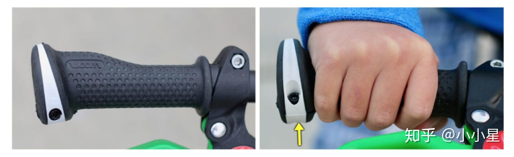 初学者难免磕磕碰碰,车把中间如果有缓冲垫会是个加分的设计。再一个就是把手那里,优先选择带有蘑菇型缓冲设计的把手,以防宝宝从侧面跌落,擦伤了小手手。
