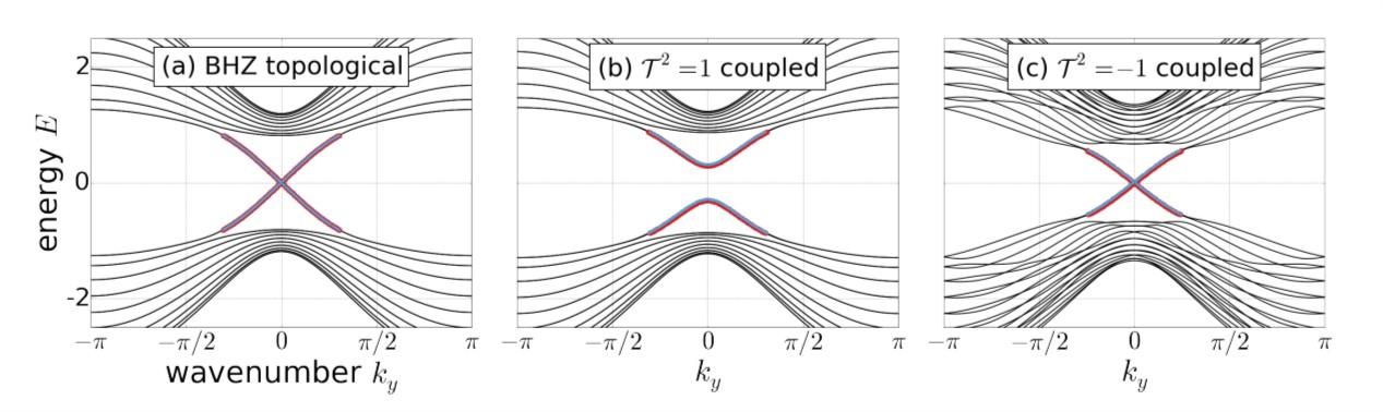 上图从左到右依次为 \hat{C}=0;\hat{C}=0.3\hat{\sigma}_x;\hat{C}=0.3\hat \sigma_y 。(由于自己画的图太过于质朴(chou),这里引用参考文献[1]的图, 其符号 \mathcal { T } 即本文中的 \hat{\Theta} )。这张图说明,就算存在coupling,只要保证这个coupling是 \hat{\Theta}^2=-1 的,即不破坏其-1的时间反演对称性,那么边缘态依然保持完好。这个性质的更广义的证明留到后面讲,至少通过这个模型我们能够非常直观的理解这个问题。