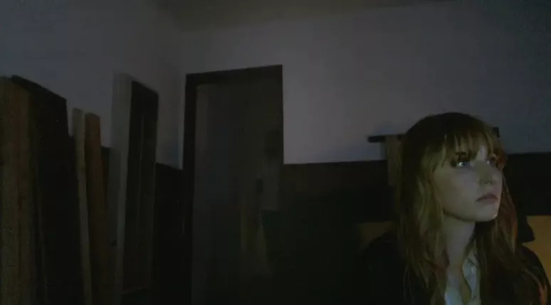 在两人的对话过程中,影片通过晃动的镜头、模糊的视频背景、刺眼的相机闪光灯,以及手电筒一晃而过的光线,制造出“鬼影”重重的惊悚效果。