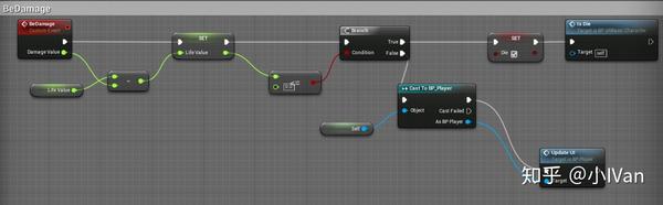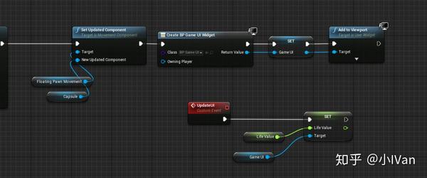 然和到BP_Player实例化它,在BeginPlay后面接上如下逻辑,新建了一个CustomEvent负责UI更新