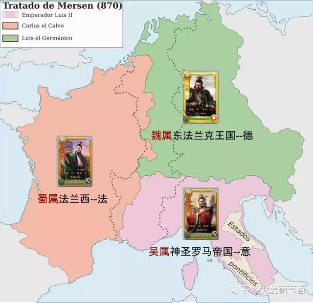 还怪那个很有名很有名的查理曼大帝(又名:红桃K先生)。他三个孙子争遗产时给闹大了,于是在公元843年签了份凡尔登条约。“Duang”的一声分裂出了“法”、“意”、“德”——西欧三国的雏形。