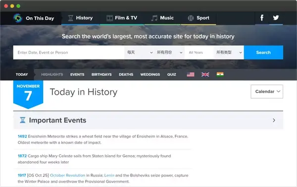 On This Day,是一个 英文版 的「 历史上的今天 」,在这个网站,你可以看到历史上发生过的重要事件、名人生日、婚礼和逝世等内容,涉及电影、音乐和体育领域。