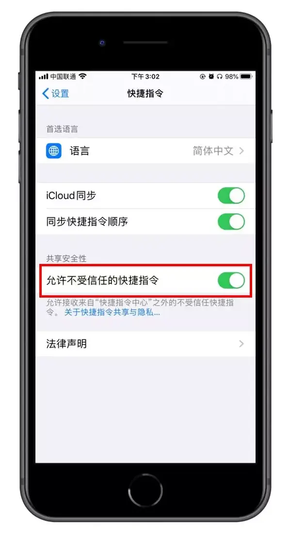 由于捷径社区的快捷指令是由个人用户创建的,并 未经过Apple官方审核 ,因此,添加捷径社区的快捷指令前,需要前往设置--快捷指令,打开 允许不受信任的快捷指令 。