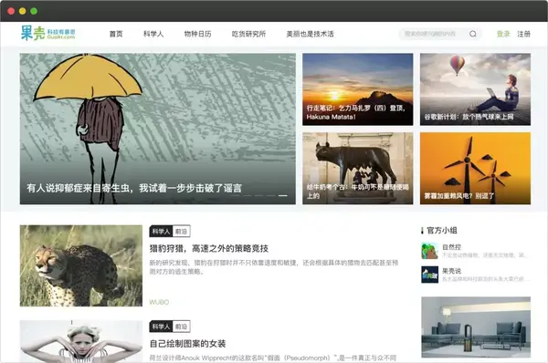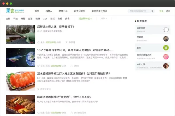 果壳网,是一个 泛科技主题 的网站,包含科技、生活、健康、人文、自然和数码等内容,不同于微博或知乎由用户主导内容生产,果壳采用的是 专职作者 的内容生产方式,因此内容质量会更有保证一些。