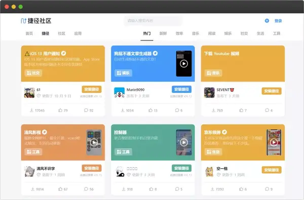 捷径社区,是一个专注于 发现和分享捷径指令 的网站,社区包含了 2000+ 可用的快捷指令,这些快捷指令可分为音乐、阅读、娱乐、社交、生活和工具。