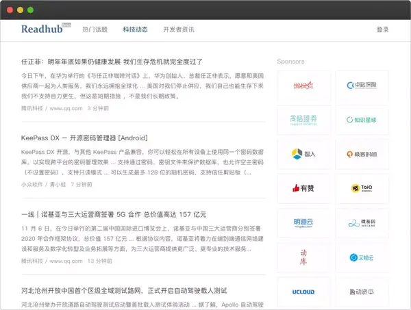 Readhub,是一个 科技资讯聚合 网站,网站通过算法自动抓取多个网站的内容,以标题和摘要的形式将资讯呈现给用户,并保留了指向原资讯的链接。