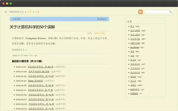 这是知名博主 @阮一峰 老师的个人博客,即便作为一名技术人,他的 博客内容并不止于技术 ,涉猎广泛,包含读书、创业、科技、互联网和随笔等。