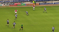 当时,博格坎普在禁区外背对球门,身后有对方后卫达比萨斯的贴身盯防,皮雷从左路传出一脚长距离滚地传球。