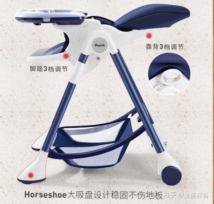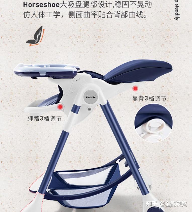 Pouch的当家产品K05,K05是一款功能齐全的高脚餐椅,不仅能够进行高度和靠背调节,还支持一键收合,收纳非常方便。另外,这款餐椅还设有特别的马蹄吸盘形前脚,相比一般餐椅更稳固,调皮的宝宝也较难让餐椅侧翻。
